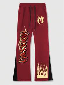 Street Life Pantalones deportivos acampanados para hombre con cintura ajustable con cordón y estampado de letras de llama con bloques de color