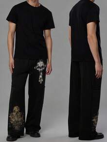 Street Life Pantalones casuales sueltos con cordón en la cintura y estampado de esqueleto de anime para hombres