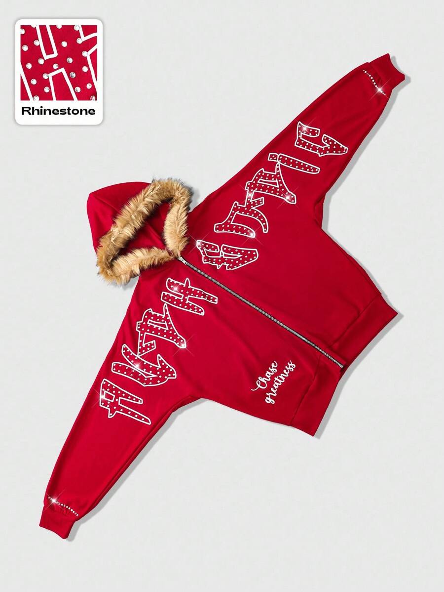 Street Life Sudadera con capucha con cremallera delantera, cuello de peluche y cristales brillantes para hombre, para otoño