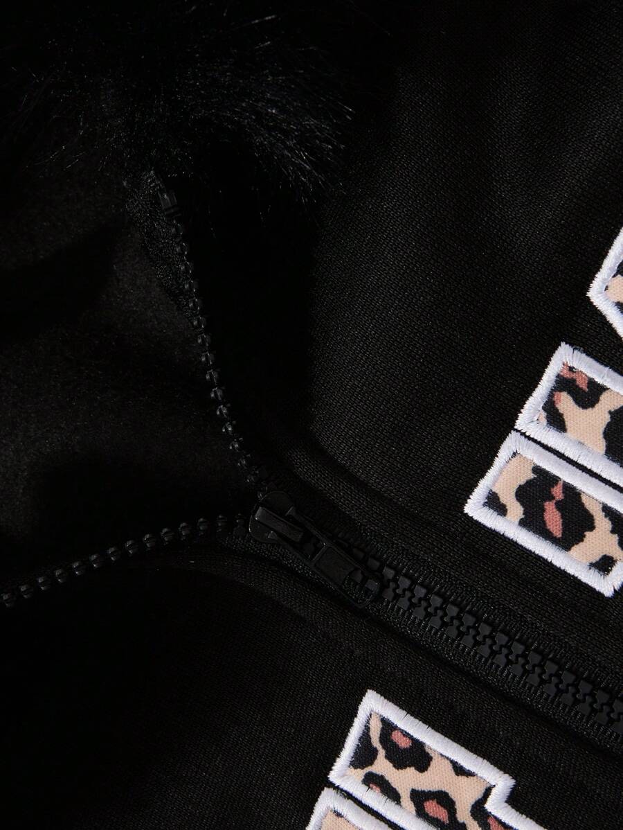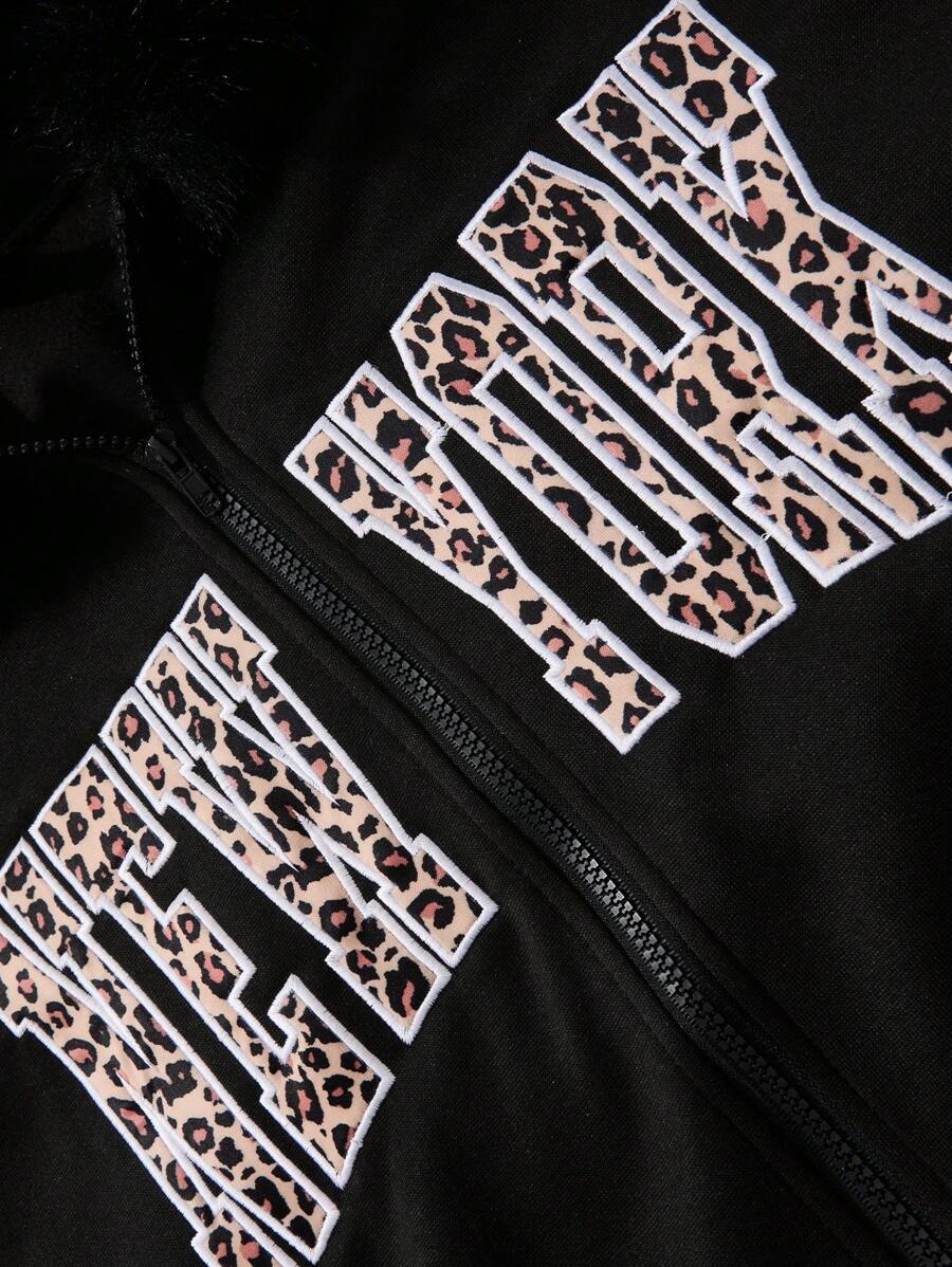 Street Life Sudadera de felpa con cuello de piel, bordado de letras y estampado de leopardo para hombre