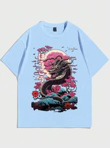 Street Life Camiseta De Manga Corta Con Letras Y Dragón Impresos Para Hombres