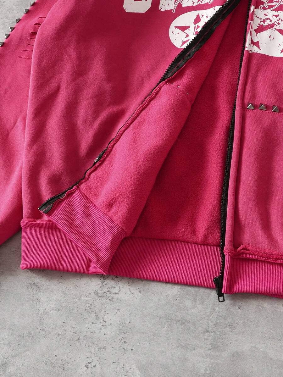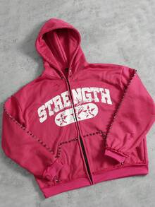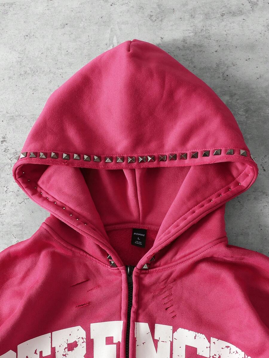 Street Life Sudadera con capucha de hombre con estampado de letras, remaches metálicos y cremallera, corte holgado