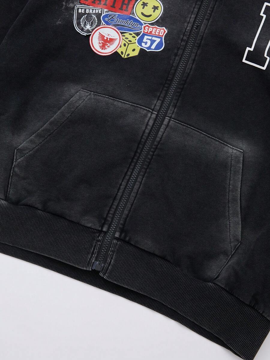 Street Life Sudadera con capucha y cremallera lavada para hombre con bolsillos y detalles en forma de letras aplicadas, de manga larga