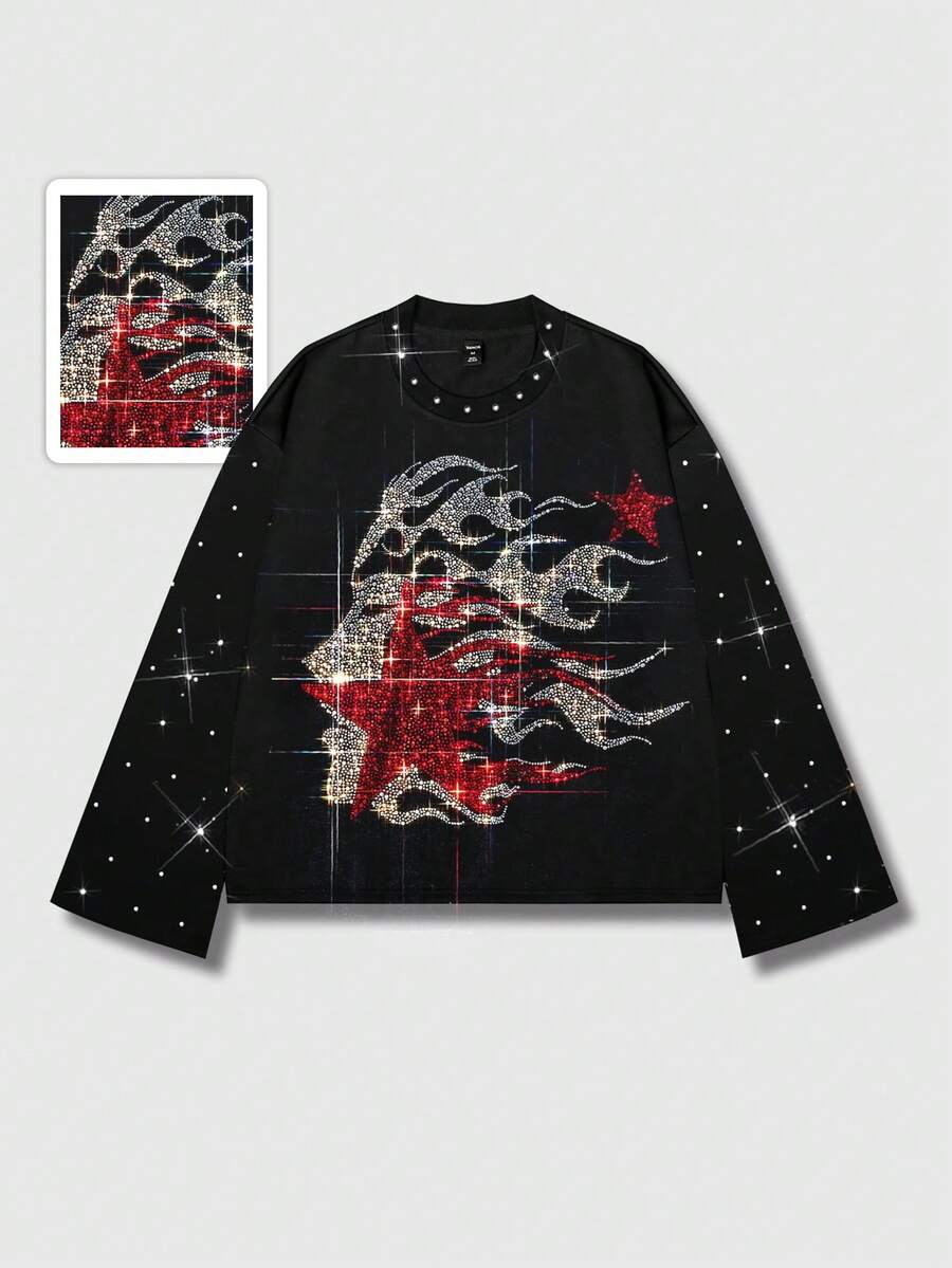Street Life Camiseta de manga larga con estampado de rostro y estrella de rhinestone, estilo de los años 2000, para hombre