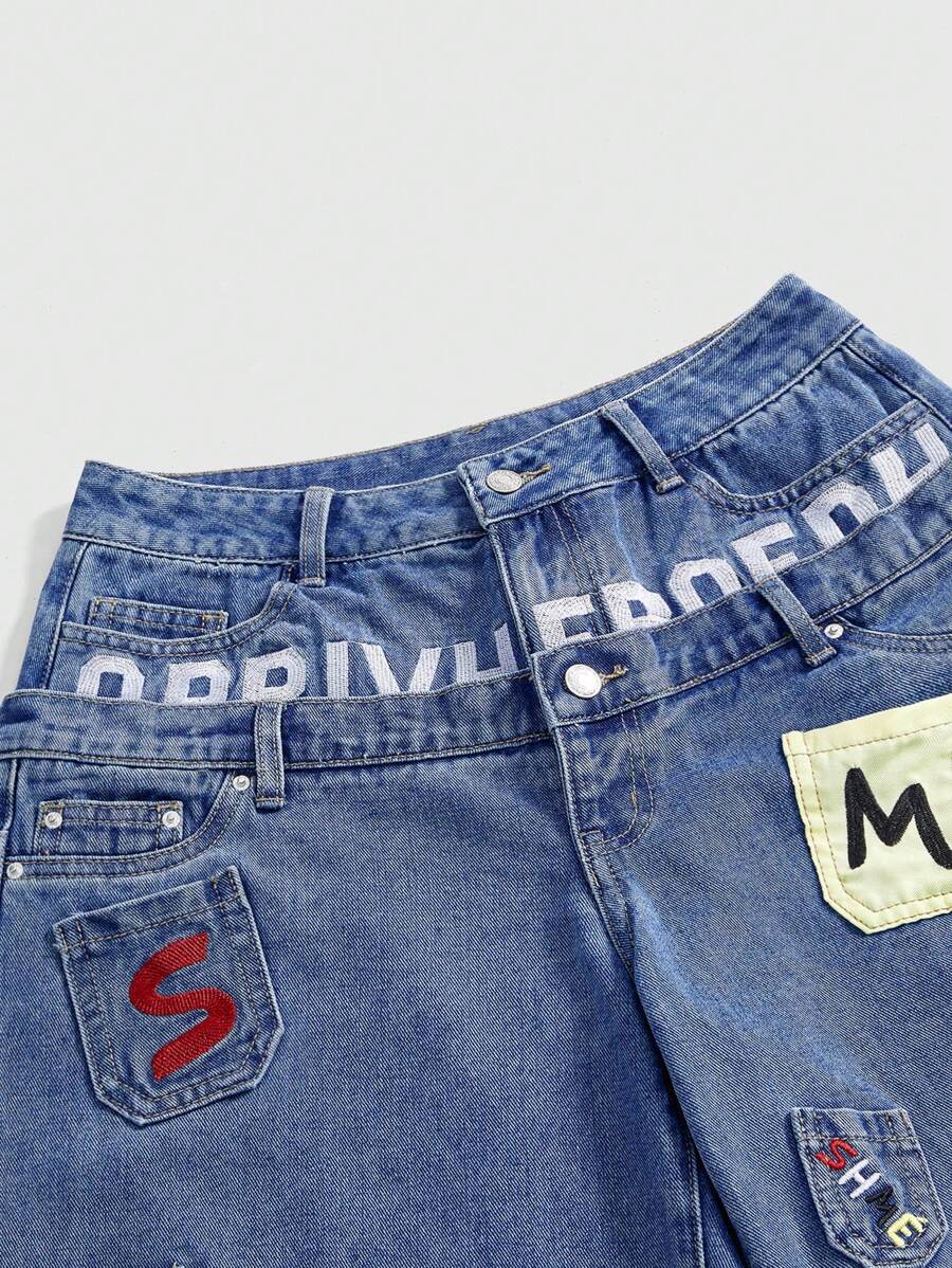 Street Life Pantalones cortos vaqueros de ajuste holgado, de cintura baja, con diseño de doble cintura y bordados, estilo streetwear Y2K