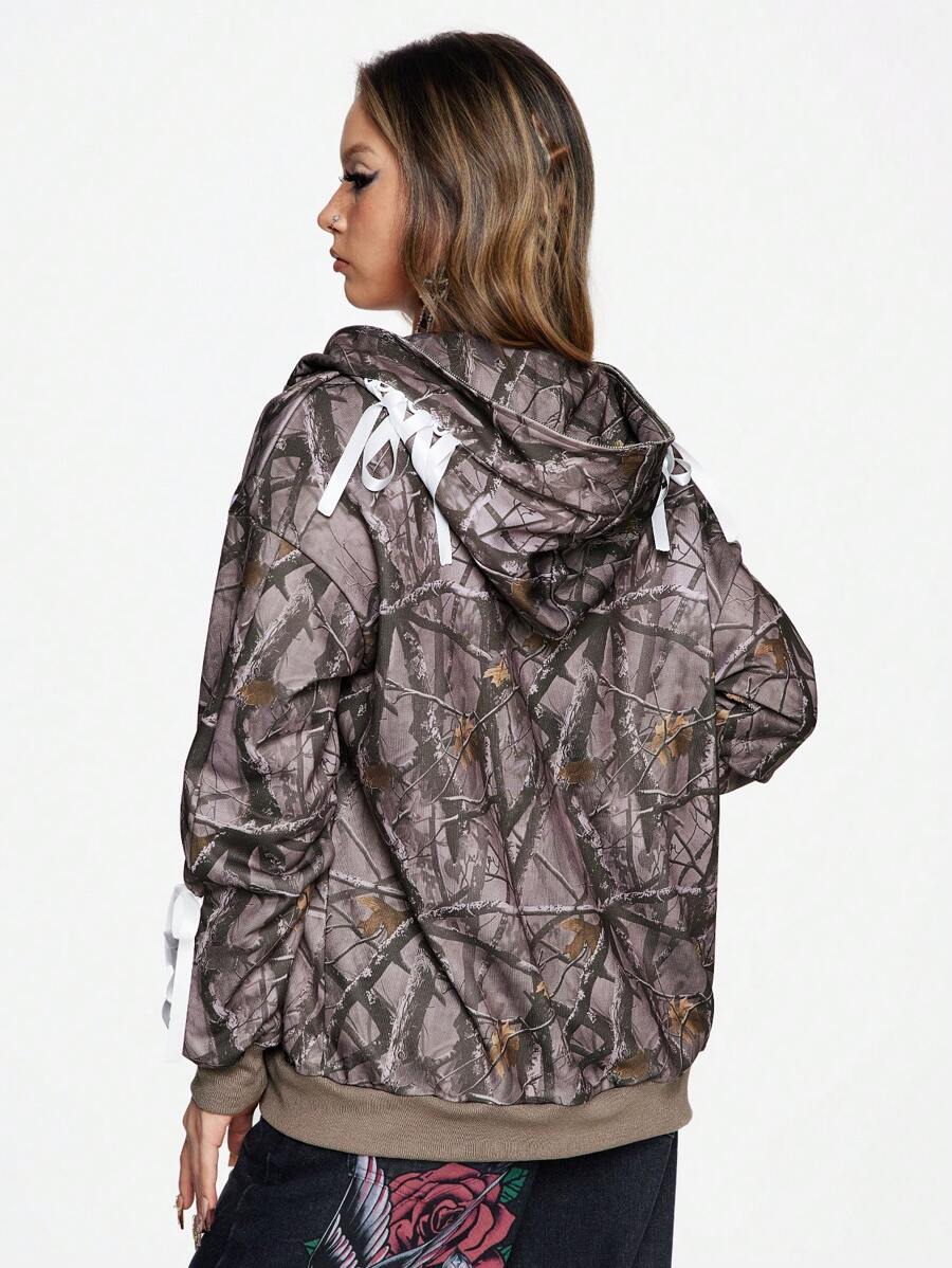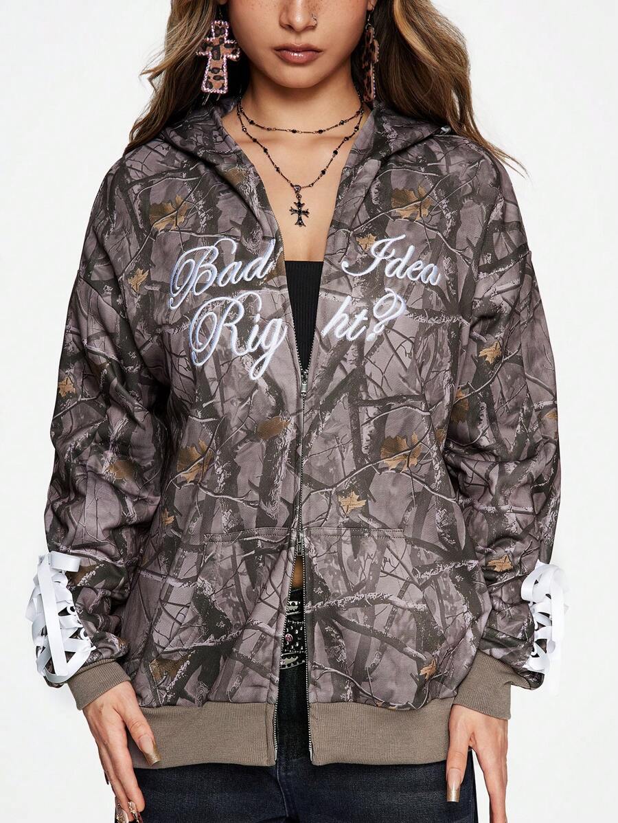 Street Life Sudadera para mujer con estampado de camuflaje y letras, y decoración de lazo y bordado en inglés, de estilo callejero Y2K