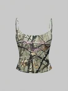 Grunge Punk Top cropped sin mangas de cuello profundo en V con eslogan de rama de color contrastante, apropiado para el verano