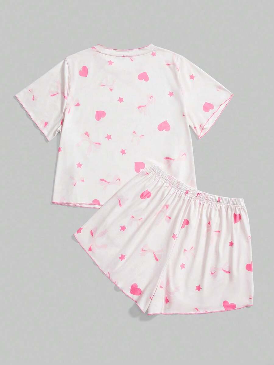Kawaii Conjunto de pijama de manga corta con estampado de lazos y corazones en todo el diseño, estilo casual y kawaii, talla grande