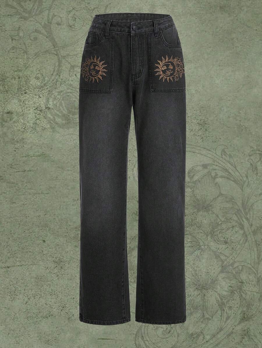 Fairycore Jeans de pierna recta con estampado de sol y luna