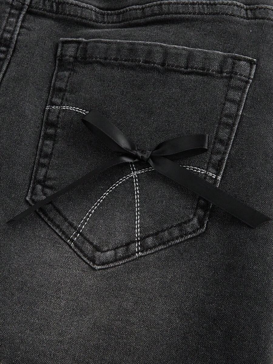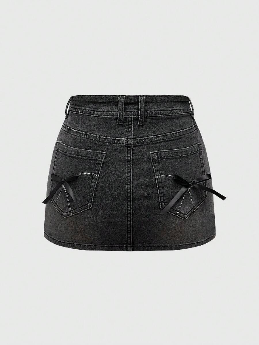 Kawaii Minifalda de mezclilla negra ajustada con lazo decorativo, elástica, para mujeres, escuela