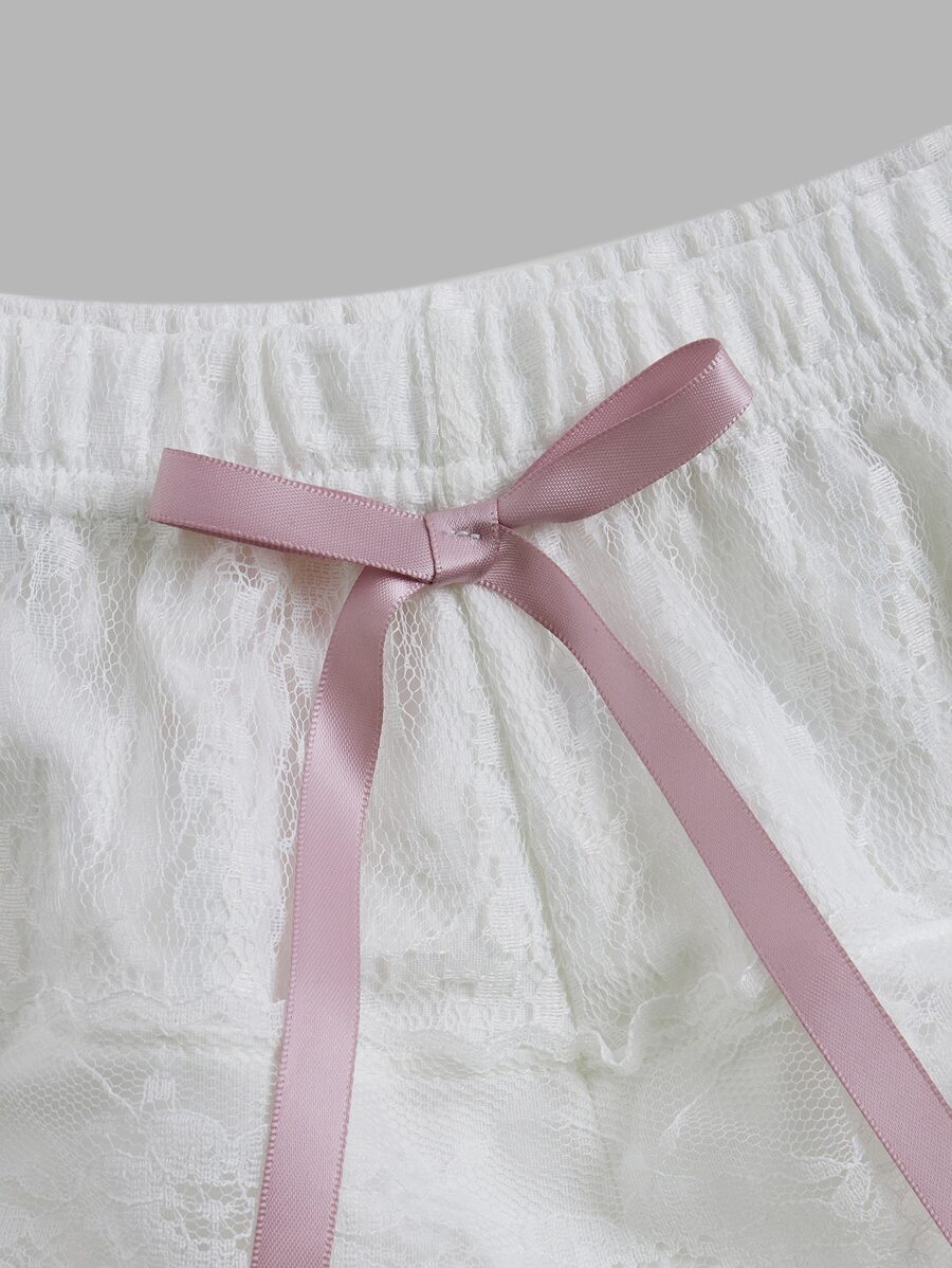 Kawaii Pantalones cortos de dormir con decoración de lazo de encaje en contraste, estilo escolar (Himekaji)