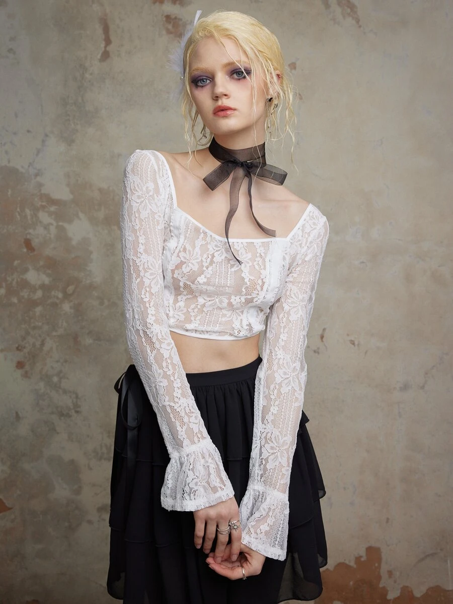 Sweetness Top con cremallera de espalda abierta de manga con volante crop con encaje