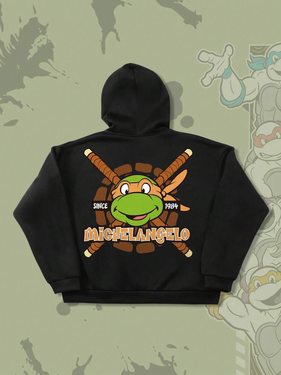 TEENAGE MUTANT NINJA TURTLES X ROMWE Sudadera con capucha de forro polar con estampado de dibujos animados, cremallera frontal y cordón, casual para hombre, otoño/invierno