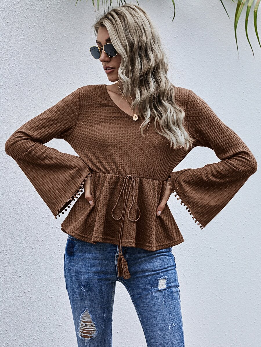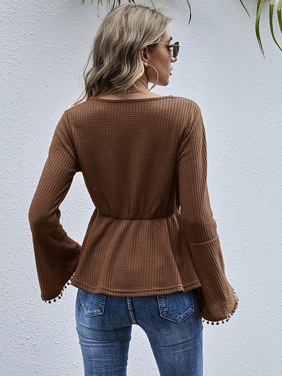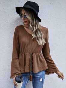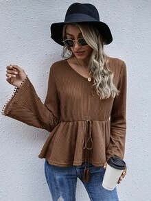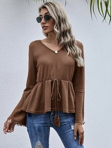 Top peplum tejido waffle con cordón delantero con fleco