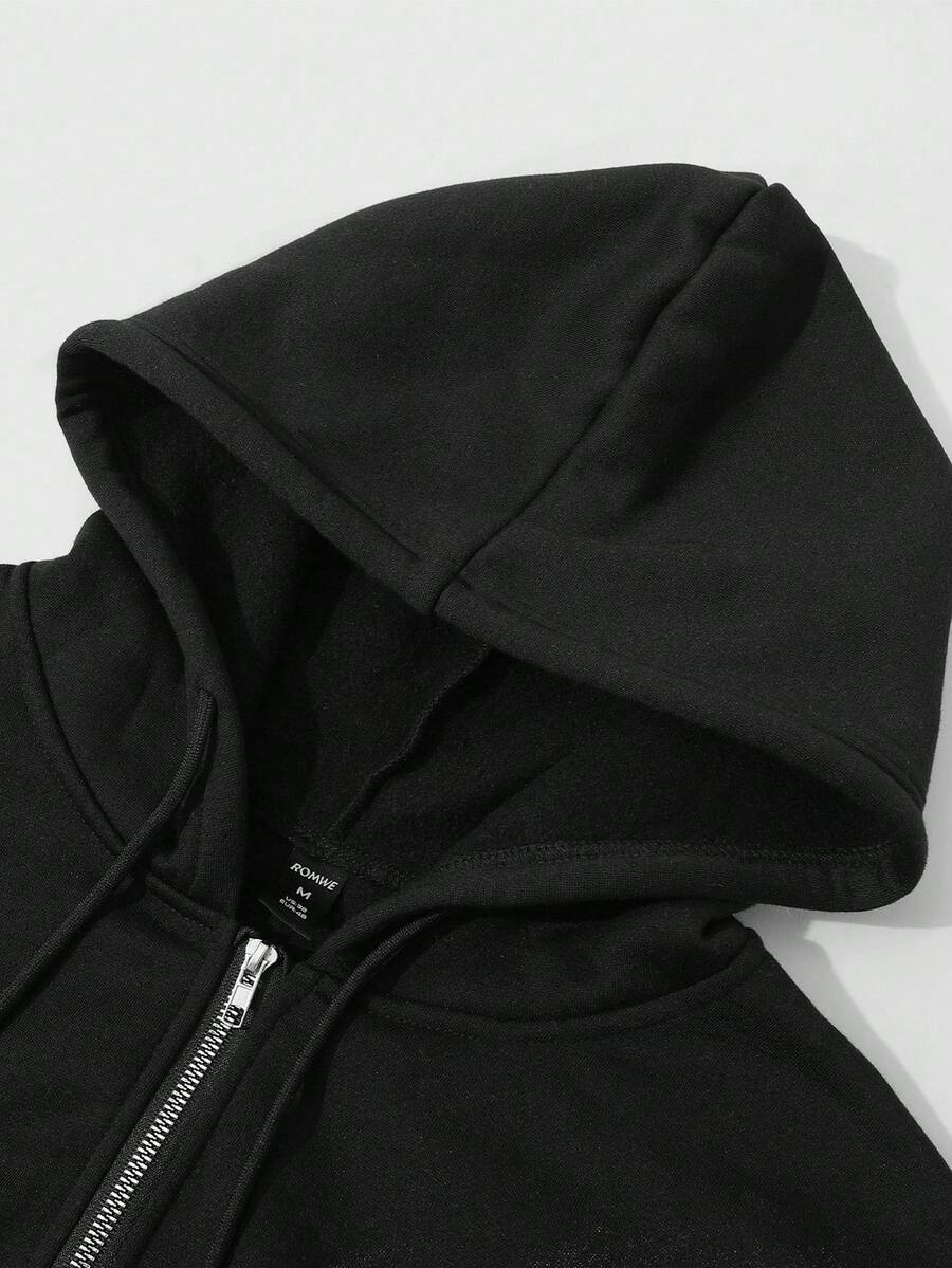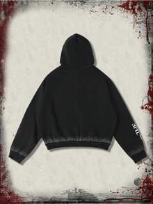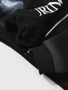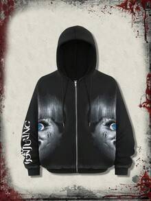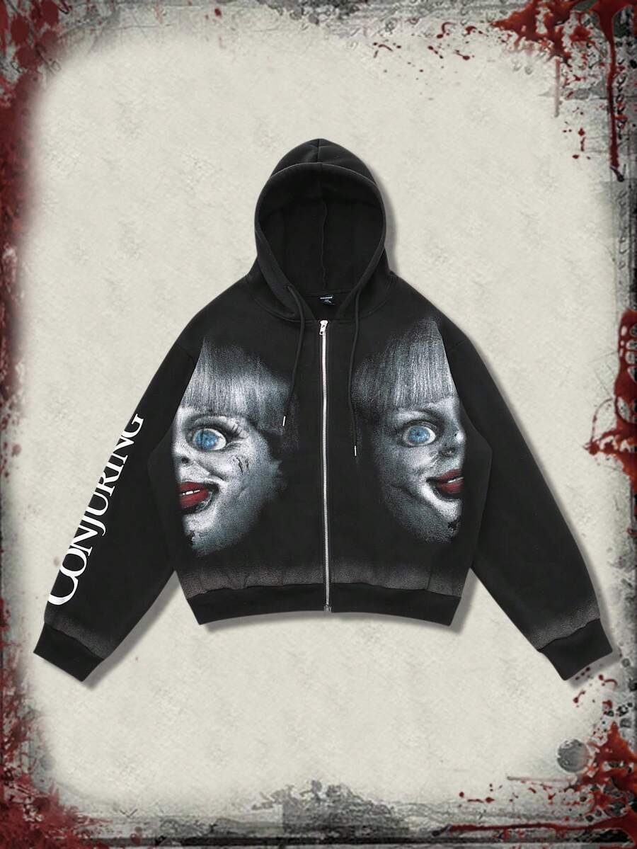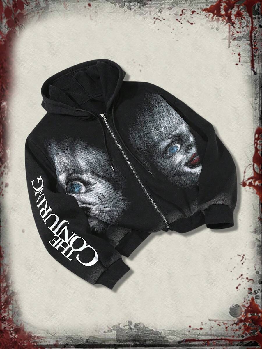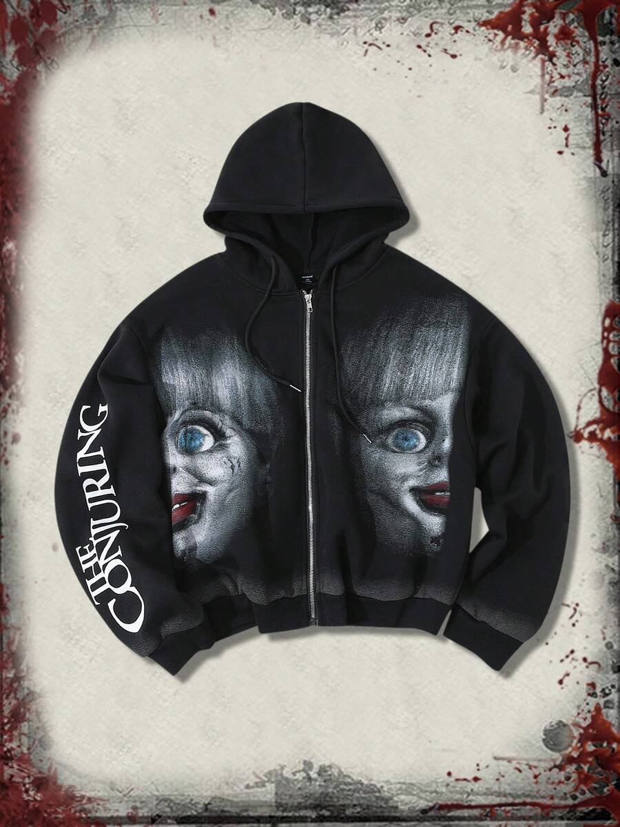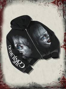 The Conjuring X ROMWE Sudadera con capucha con cremallera y gráfico de figura para hombres, adecuada para otoño/invierno