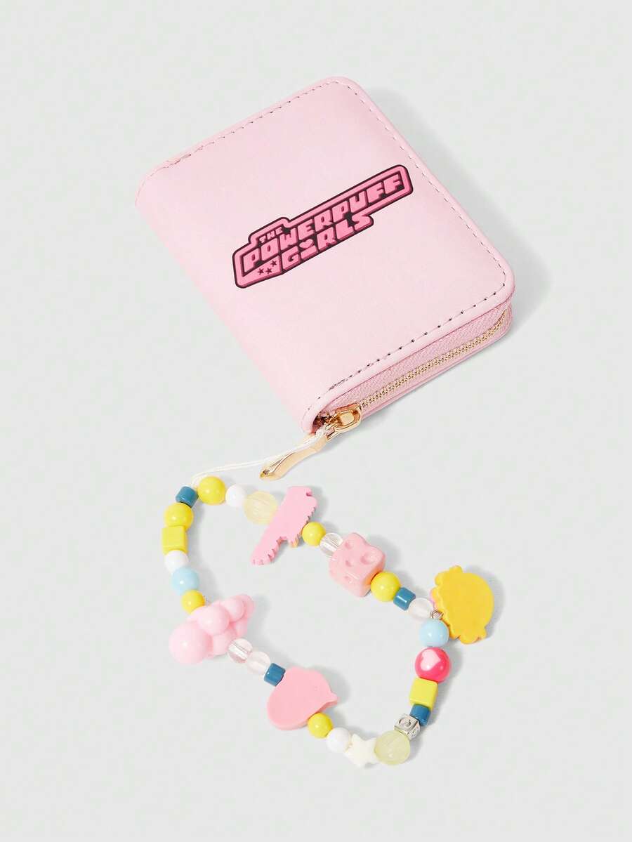 The Powerpuff Girls | ROMWE Billetera pequeña con lindo patrón de flores rosas, burbujas y botones de oro