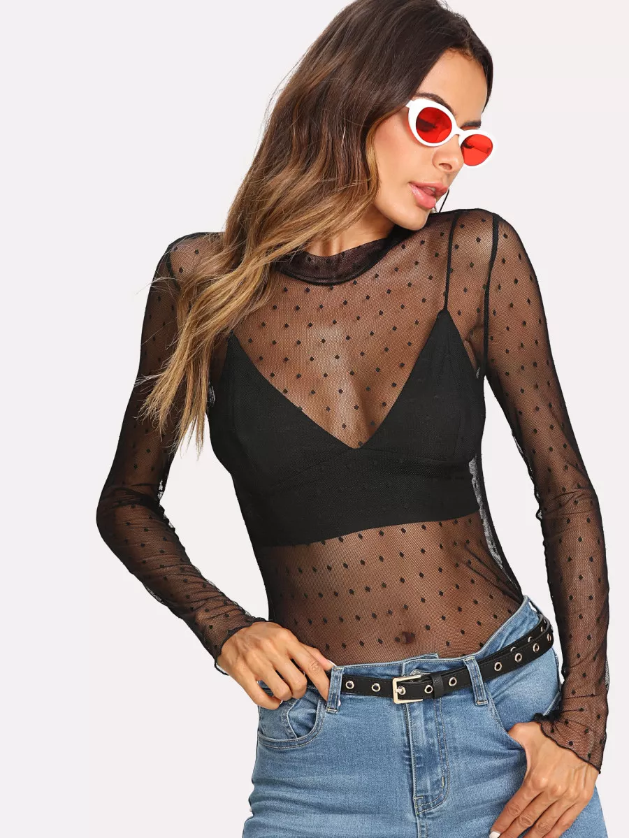 Top transparente de lunares de manga larga