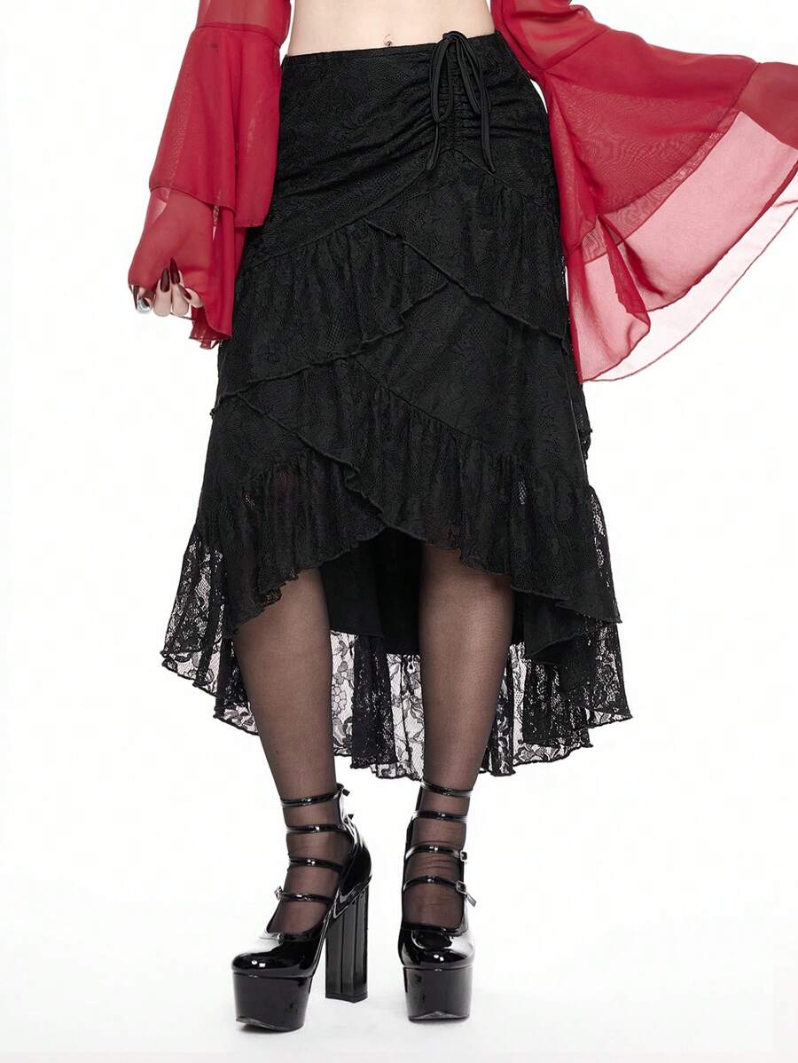 Falda con bajo asimétrico negro para el Día de San Valentín, falda de mujer con encaje, volantes y cordón elástico, atuendos de verano para mujer