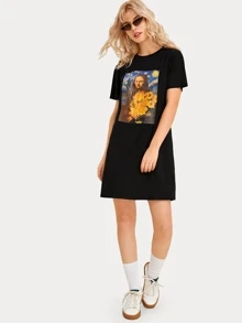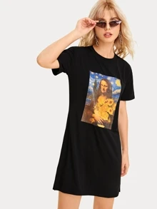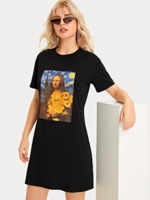 Vestido estilo camiseta con estampado de girasol y Mona Lisa