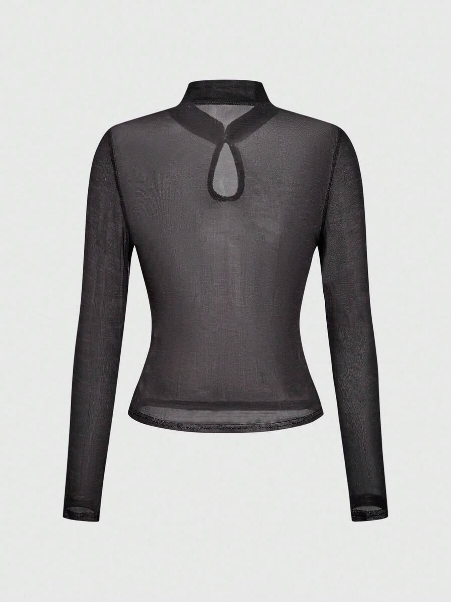 ROMWE Avant Blusa de manga larga con cuello Mao, estampado de Buda, estilo vintage chino, ceñida y transparente, sexy para mujer
