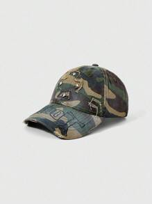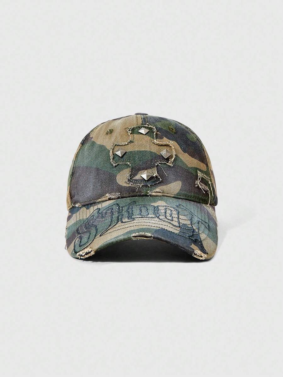 Grunge Punk Gorra de béisbol asimétrica con estampado de cruz remachada con camuflaje vintage desgastado, sombrero de sol vintage, personalizado, moda versátil unisex snapback