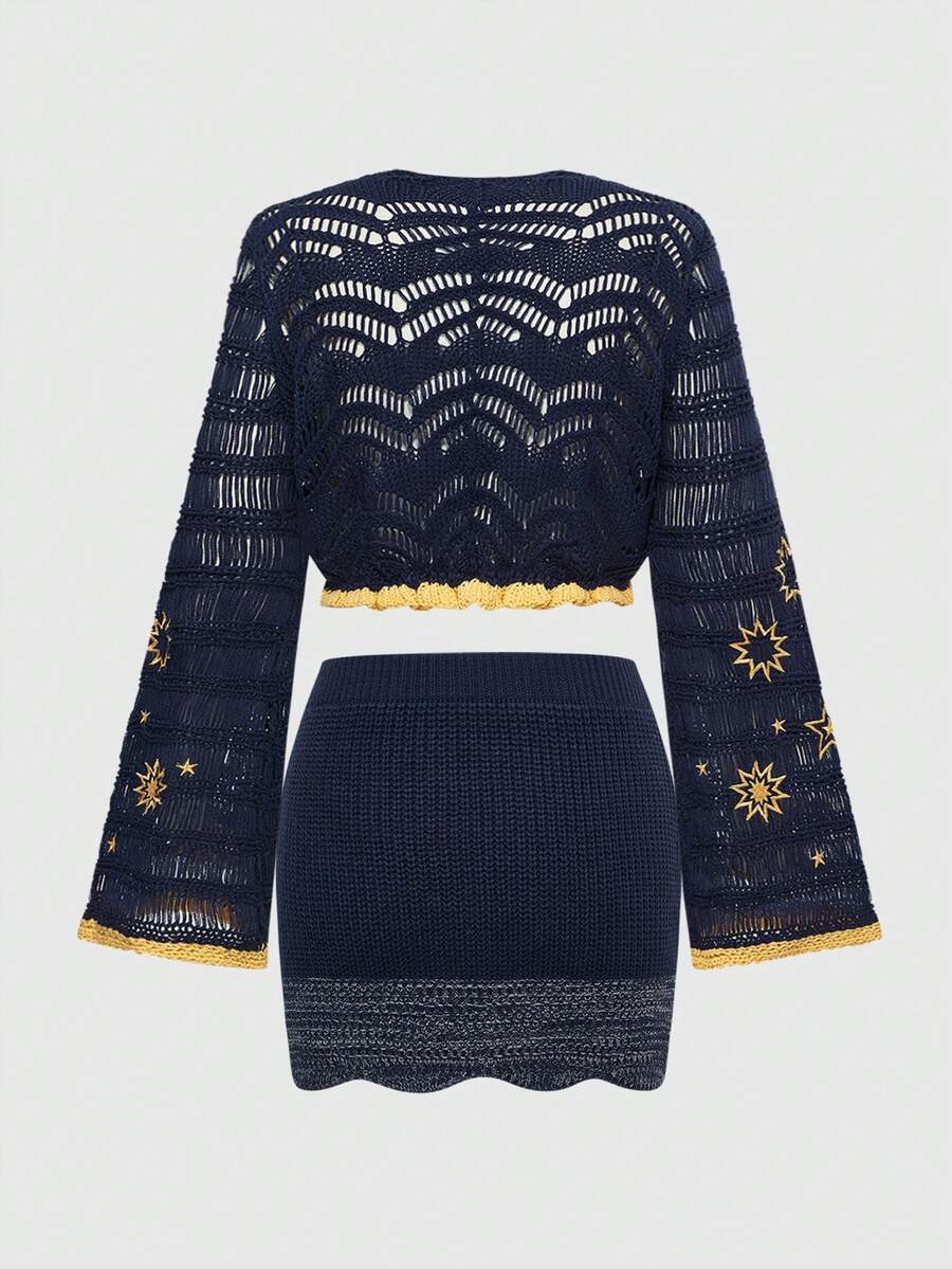 Hippie Conjunto de 2 piezas de cárdigan y minifalda con patrón de estrella y luna vintage hippie en colores contrastantes