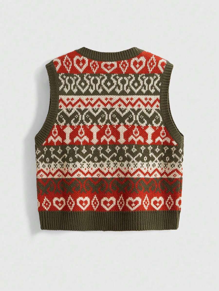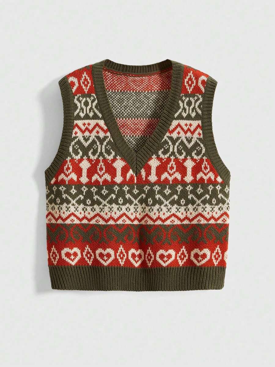 Fairycore Chaleco de punto jacquard vintage para mujer, chaleco de suéter sin mangas de cuello en V, estilo retro, prenda para capas con ambiente acogedor, otoño