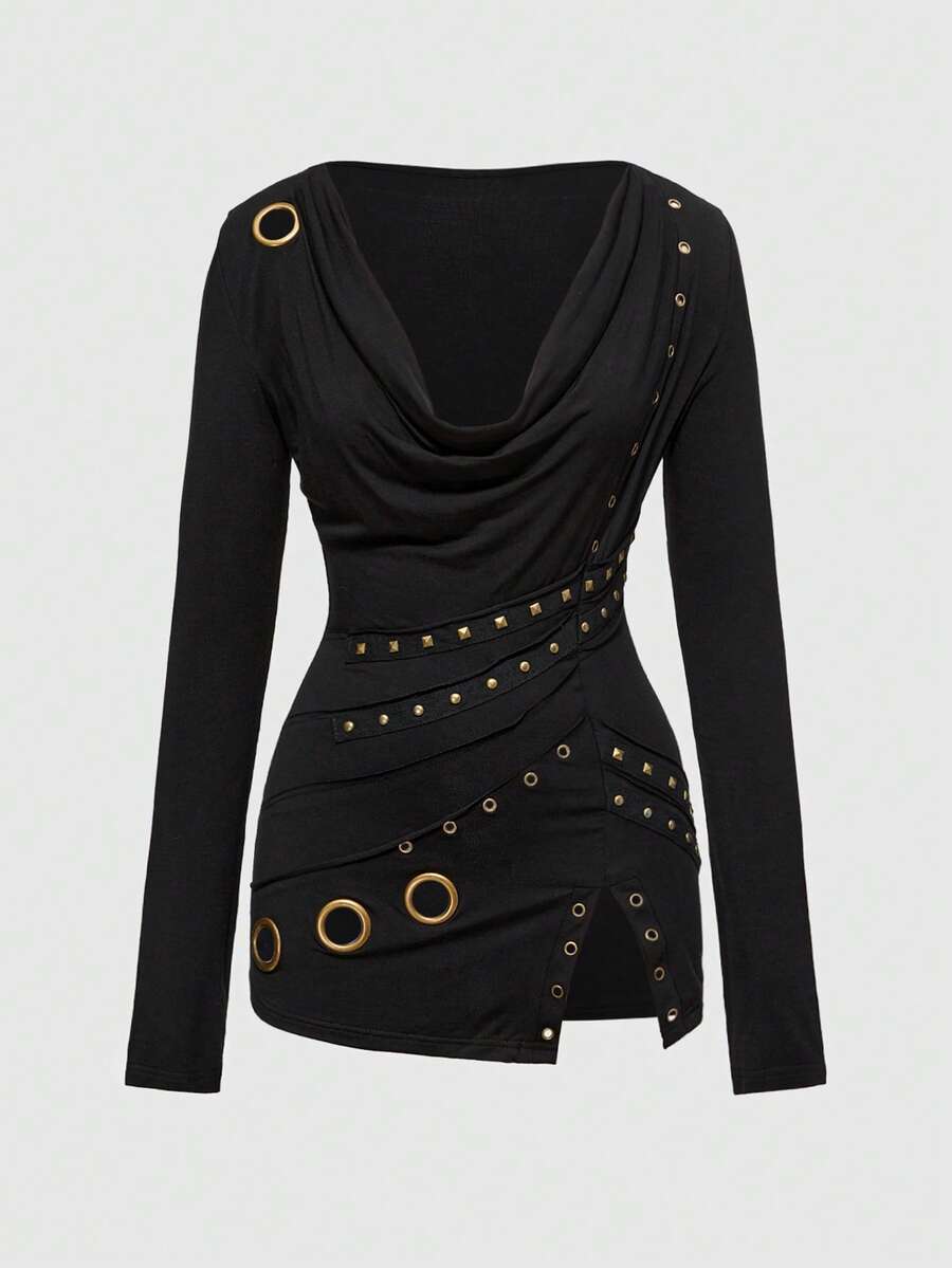 Grunge Punk Camiseta de manga larga ajustada con cuello en pico, diseño de ojetes metálicos vintage punk y bajo con abertura