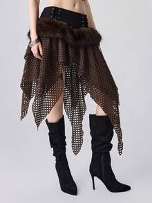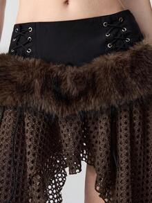 Grunge Punk Falda corta de mujer de cintura baja con diseño de cordones, patchwork de malla y encaje, en estilo vintage romántico Y2K, apocalíptico y con detalles de piel