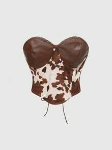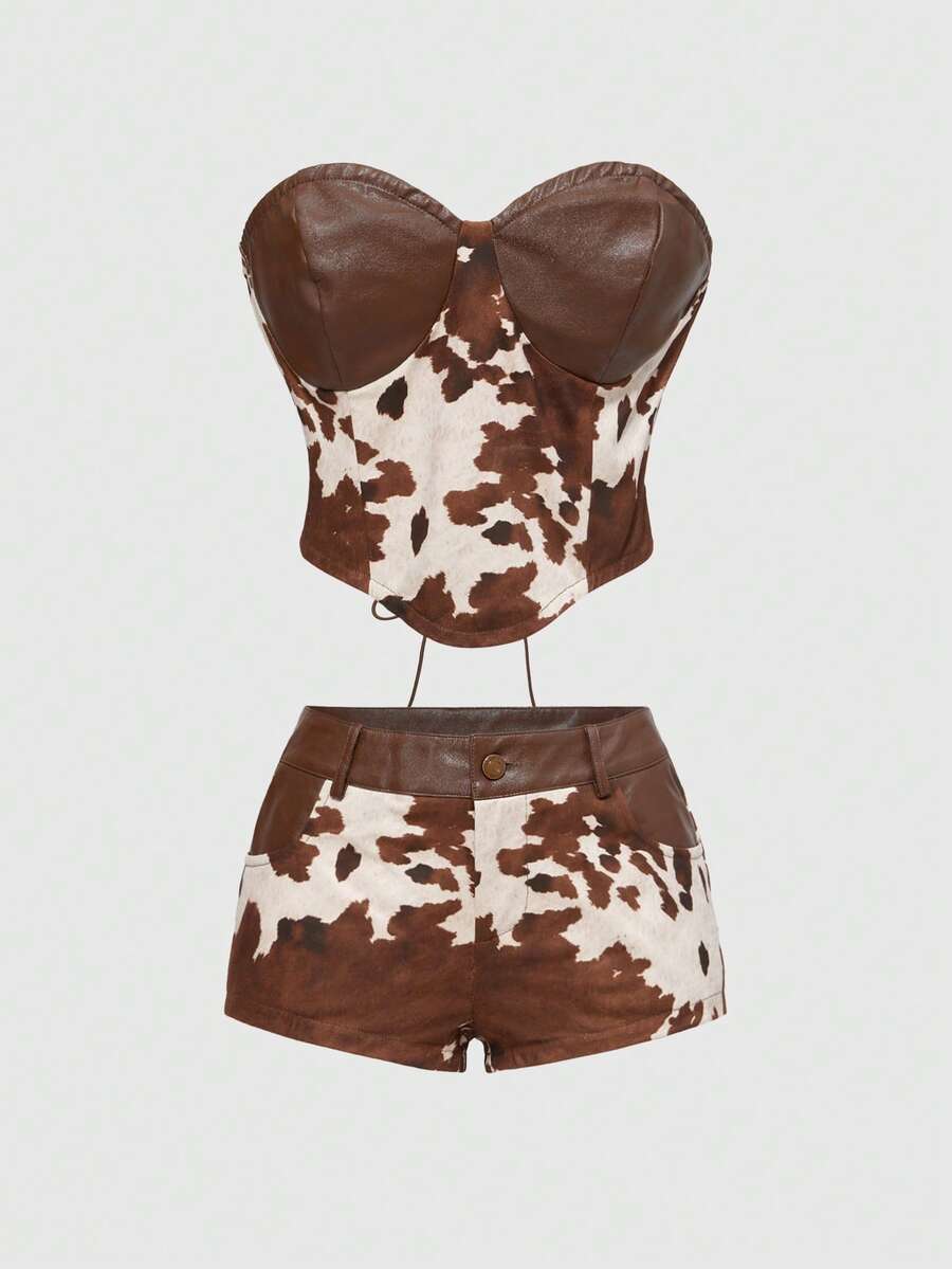 Grunge Punk Conjunto de 2 piezas de top corto y shorts mini con estampado de animal de estilo vintage western y patchwork de PU para mujeres