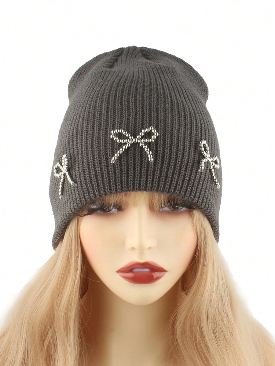 Kawaii Sombreros de invierno calientes de punto para mujer, elegantes con lazo con cuentas estilo coreano, sombreros bonitos, gorros de moda urbana de hip hop, gorra de esquí para deportes al aire libre, regalo del Día de San Valentín