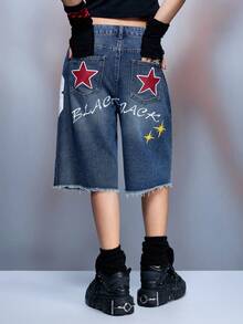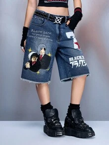 Black Jack X ROMWE Jeans capri de mezclilla de pierna ancha con dobladillo crudo, estampado de personaje de dibujos animados y letra de pentagrama, moda casual y chic de calle para mujeres