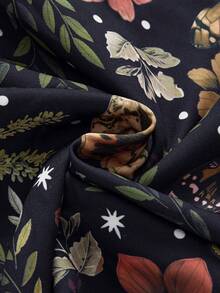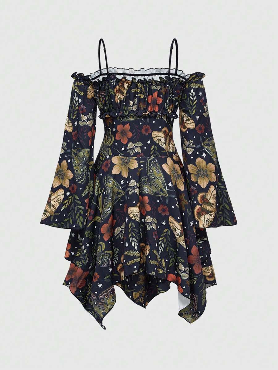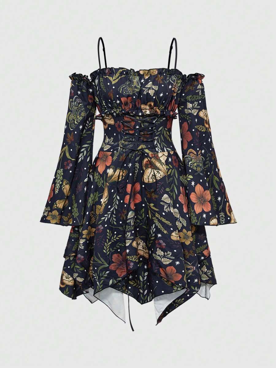 Fairycore Vestido casual de mujer con estampado floral y mangas acampanadas con cruce, otoño