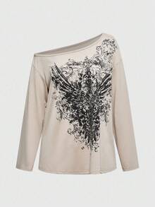 Grunge Punk Camiseta de manga larga con estampado gráfico y hombros oblicuos de estilo casual para mujer
