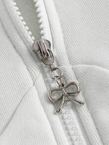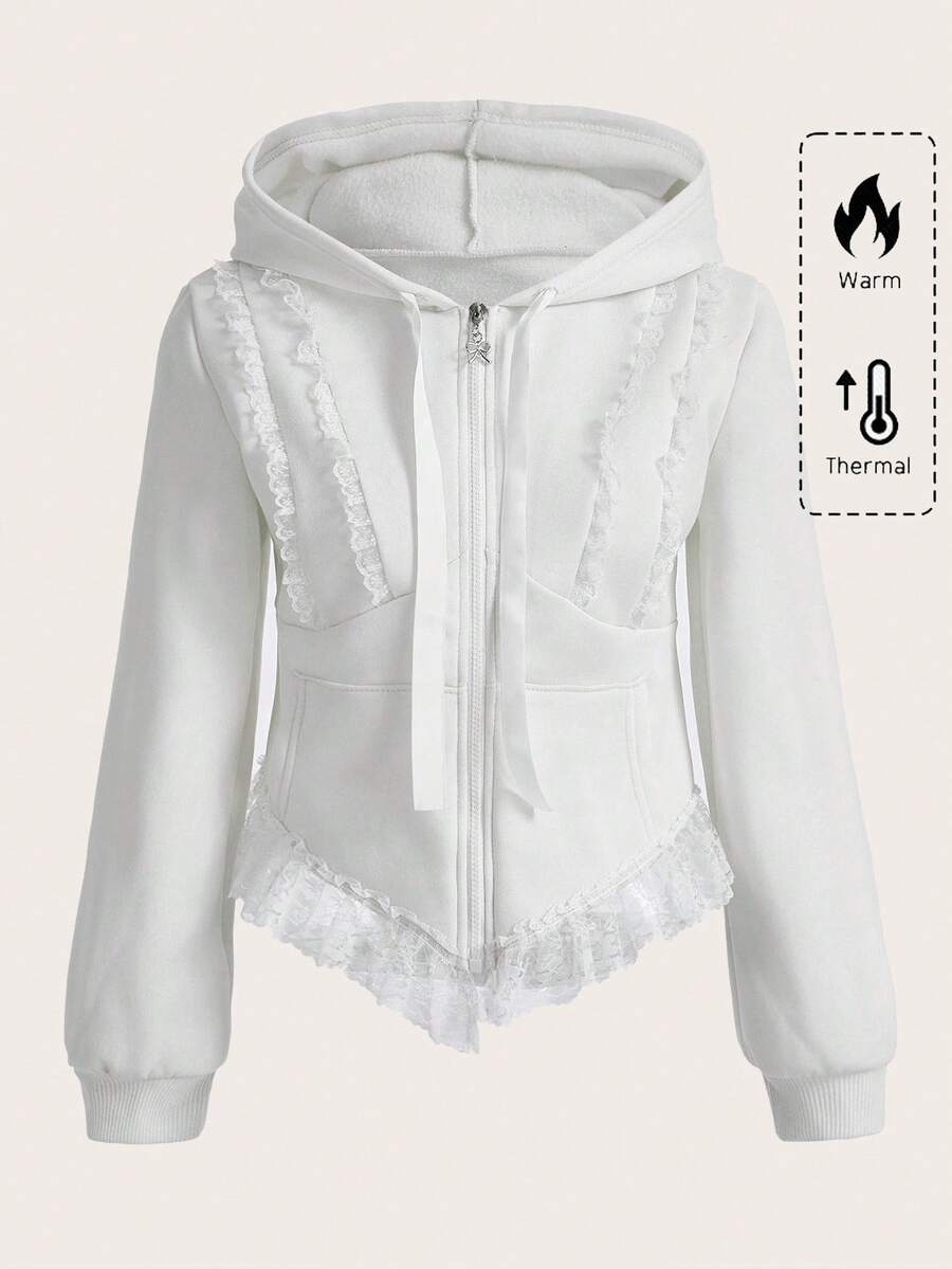 Kawaii Sudadera con capucha casual con cremallera, cuello y puños con volantes de encaje en contraste para mujer