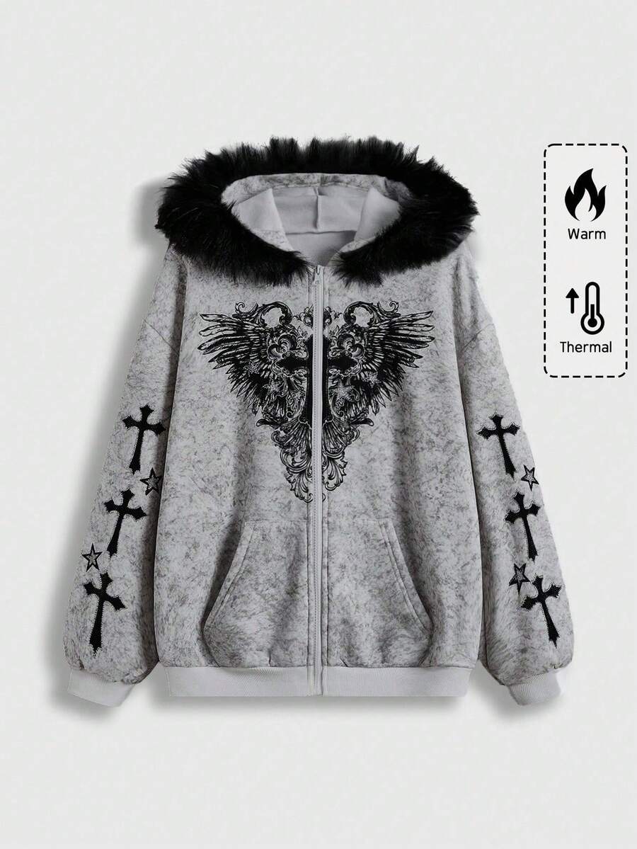 Fairycore Sudadera con capucha con estampado de cruz, forro polar, cierre con cremallera, lavado desgastado, para otoño/invierno