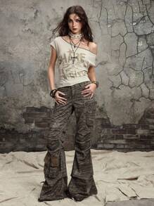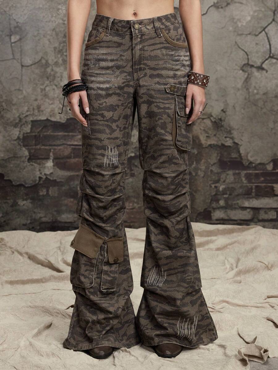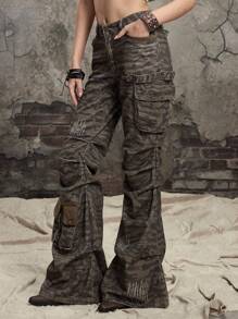 Grunge Punk Jeans acampanados de cintura baja con bolsillo de carga en estilo militar colorido y desgastado vintage para mujer