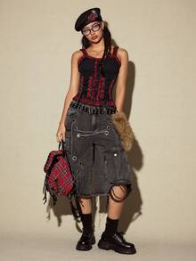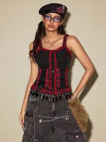 ROMWE Avant Top de tirantes con volantes, estilo universitario retro, de vuelta al colegio, de moda callejera, con diseño de cuadros de parche y contraste de colores para mujer