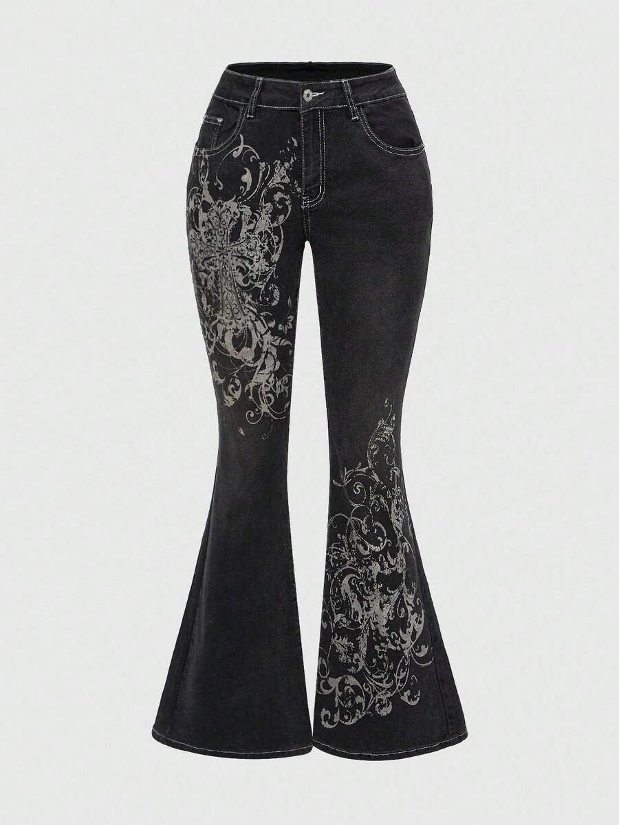 Grunge Punk Jeans de tiro bajo sexy con efecto desgastado y estampado de cruz y vid, estilo retro grunge y vintage para mujer