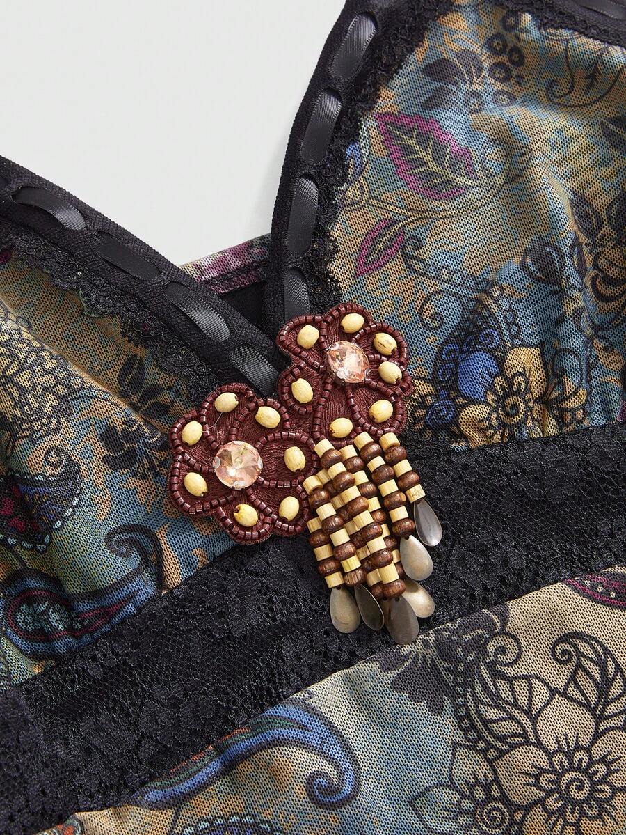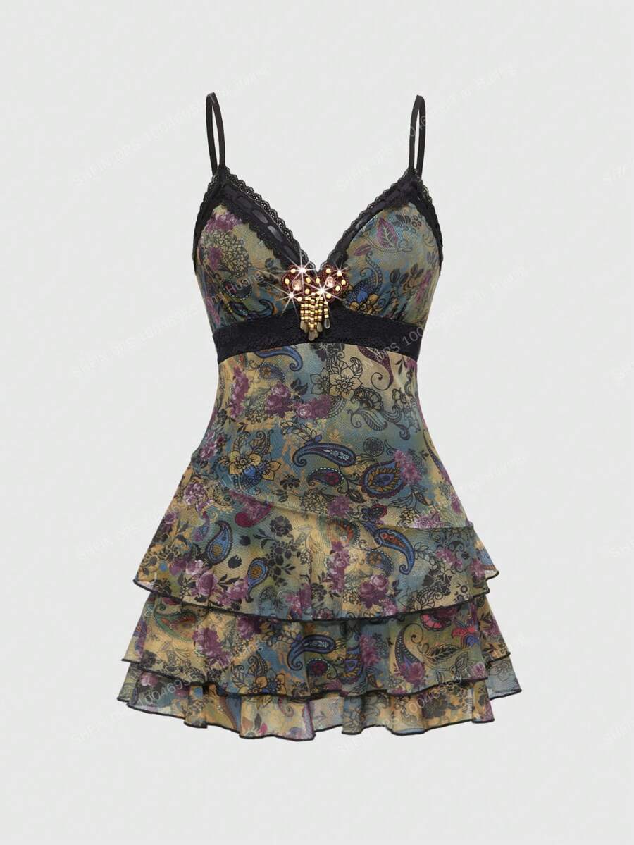 Hippie Vestido mini con volantes, cinta y encaje con estampado de paisley vintage hippie retro para mujer