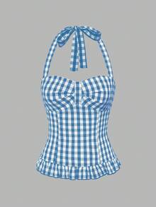 ROMWE Avant Conjunto de camiseta sin espalda con cuello halter de estilo romántico de vacaciones con lunares y cuadros para mujer