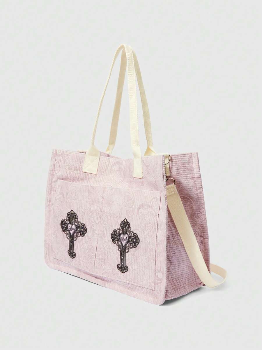 Kawaii Bolso de mano blanco de pana espacioso para mujer - Bolso convertible con estampado de lazo y floral para usar como bandolera/hombro, bolsos de mano para mujer, esenciales para la universidad, rosa