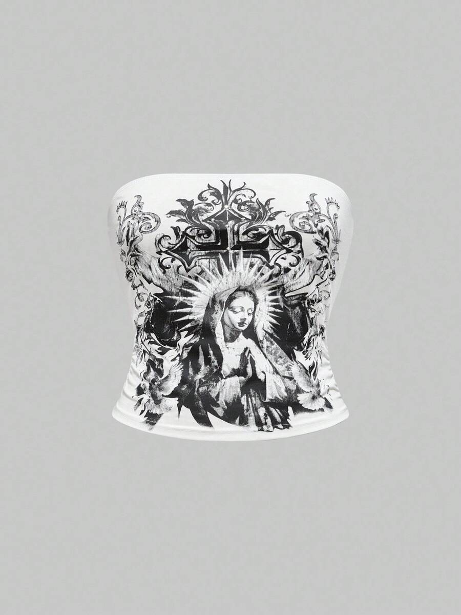 Goth Top de tirantes con decoración de cristales con cruz y Virgen María para mujer
