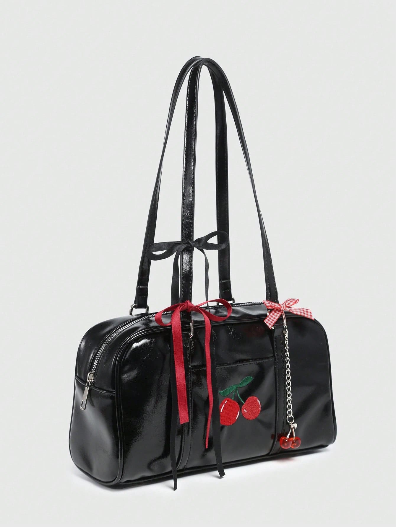 Kawaii Bolso de hombro/bandolera vintage con lazo y decoración de cerezas para mujer, bolso de Boston con múltiples bolsillos, para la escuela, con elementos kawaii de cerezas