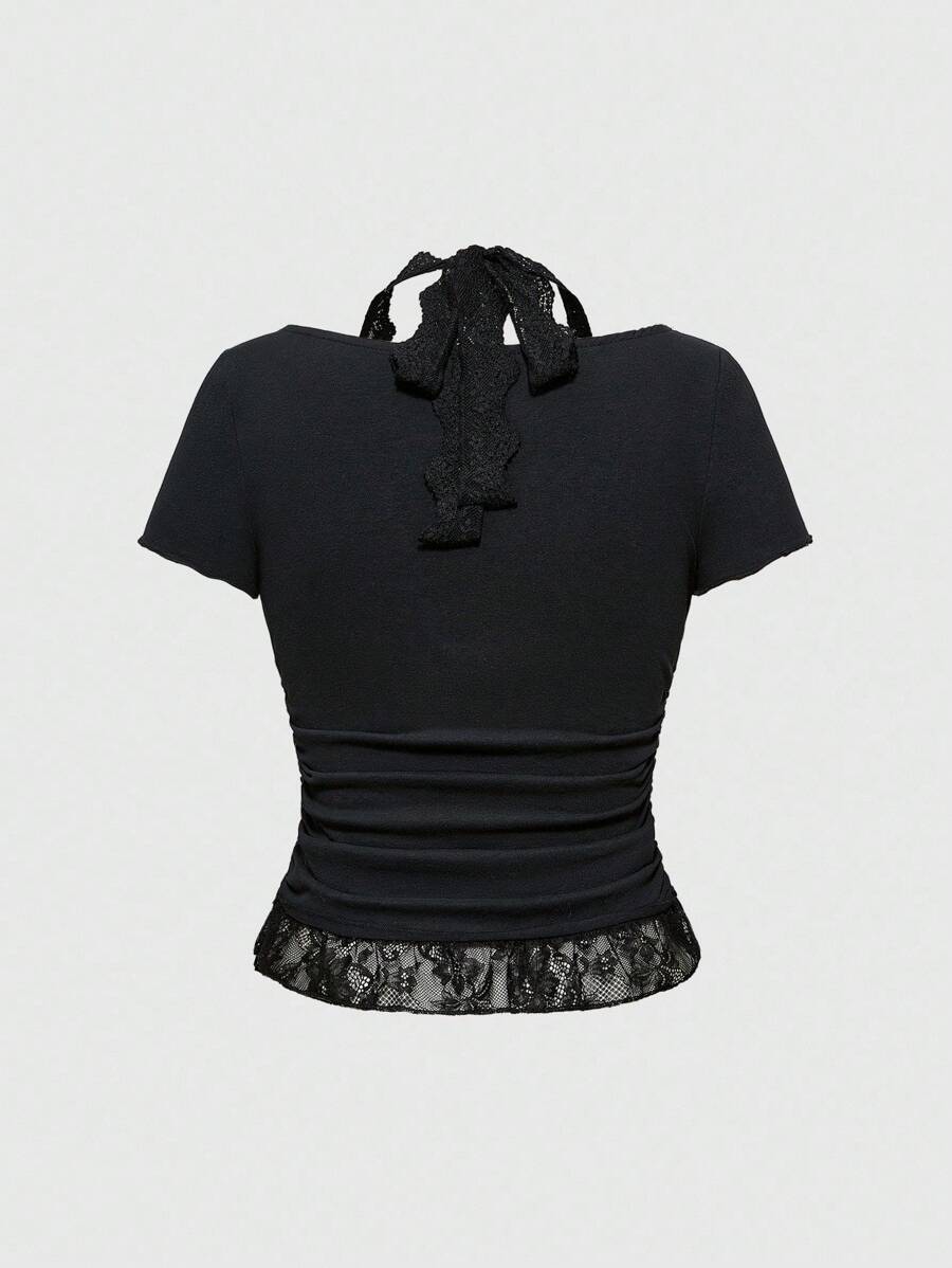 ROMWE Avant Camiseta básica ajustada con adorno de encaje y strass con diseño de bandera de EE. UU. estilo vintage Y2K para mujer