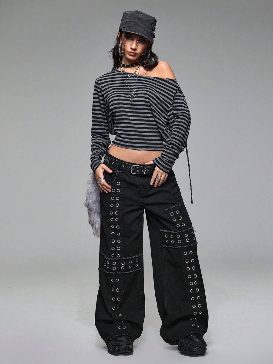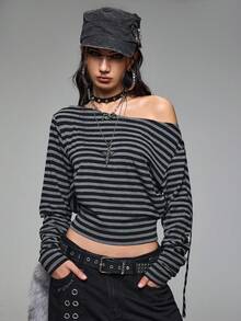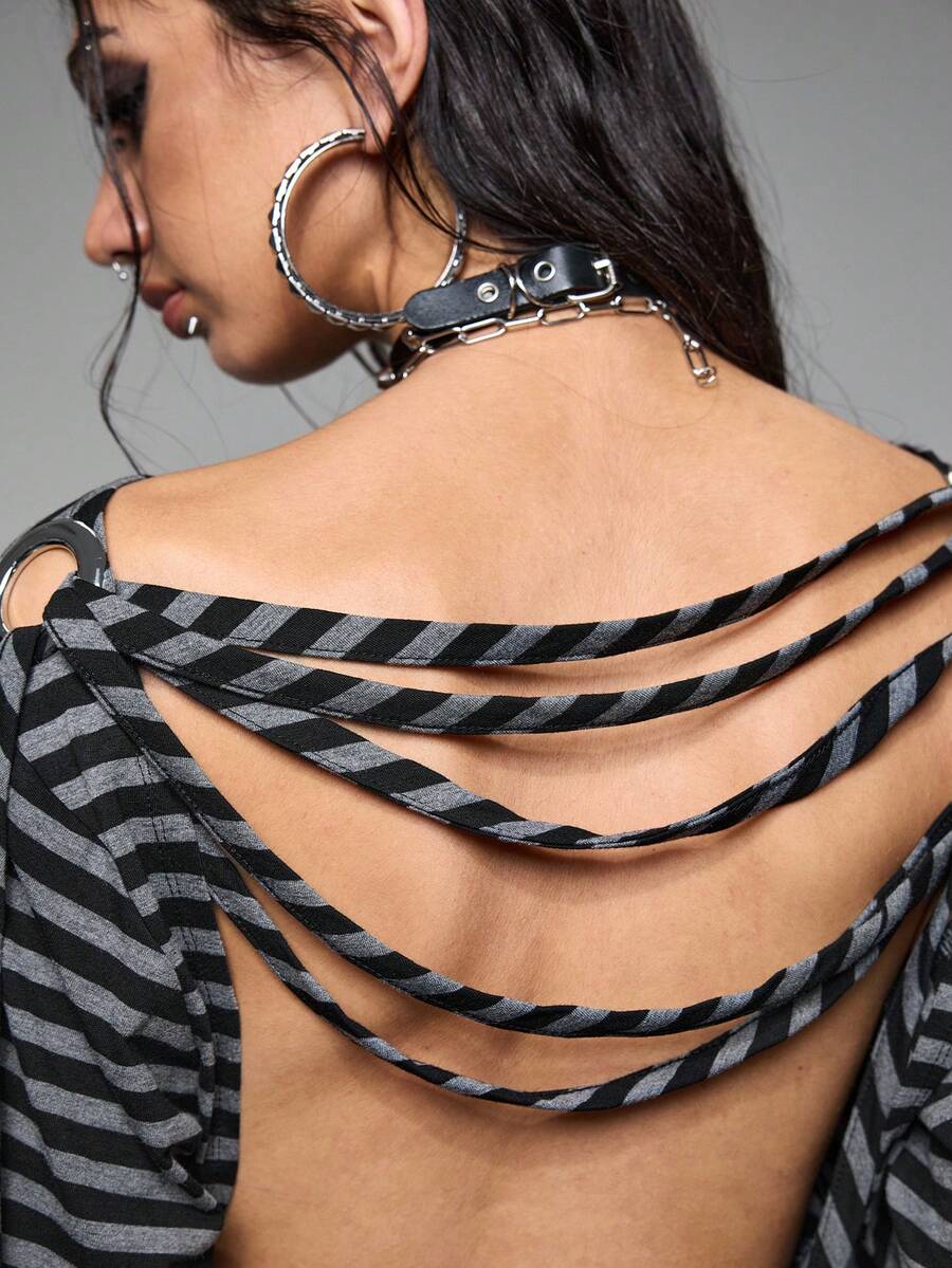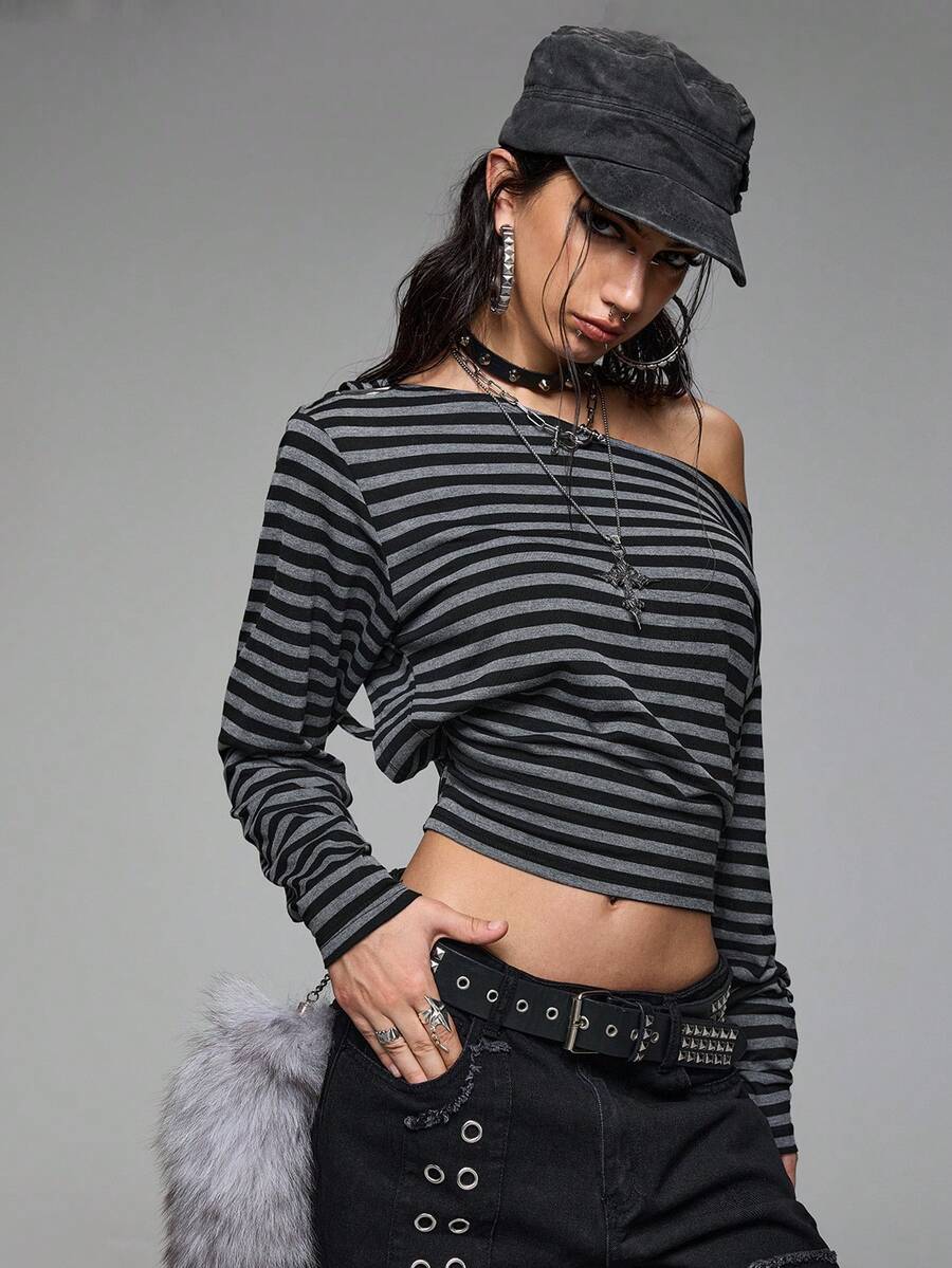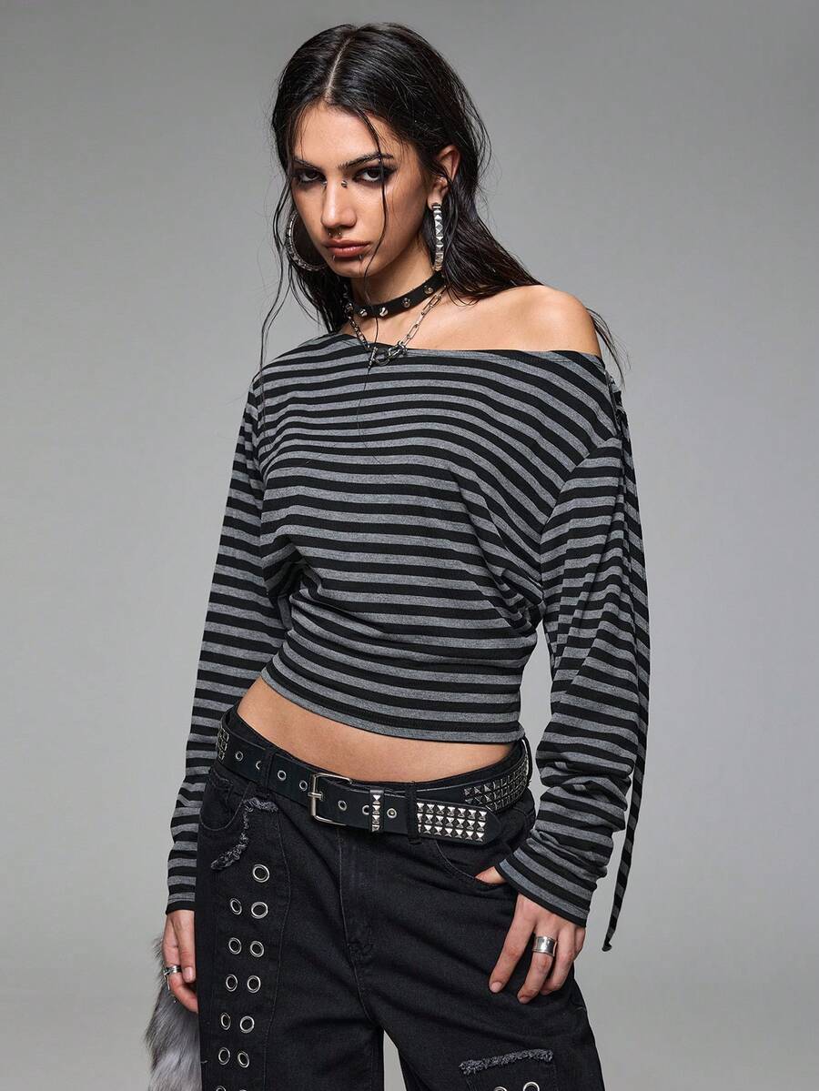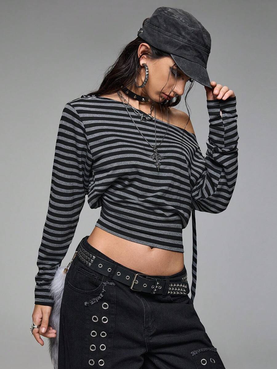 Grunge Punk Camiseta de manga larga con hombros descubiertos, espalda descubierta, recortes laterales y decoración de ojetes en estilo Y2K baddie a rayas negras y grises para mujer
