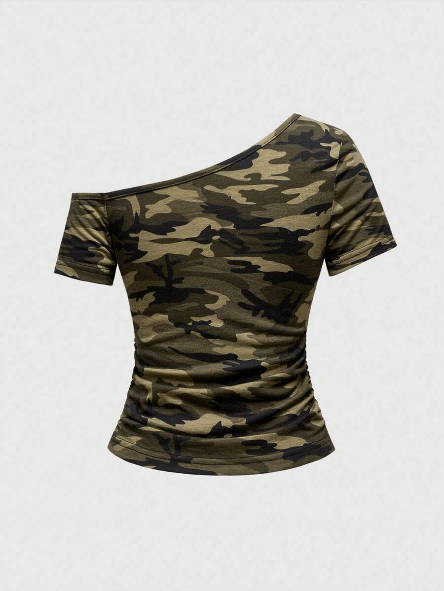 Camiseta de moda de manga corta con hombro asimétrico, fruncida, con decoración de letras y rhinestones en estampado de camuflaje Y2K para mujer