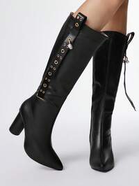 Botas altas hasta la rodilla con diseño de doble hebilla, puntera cuadrada y tacón de aguja para mujer