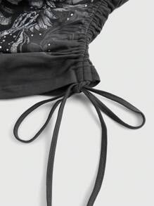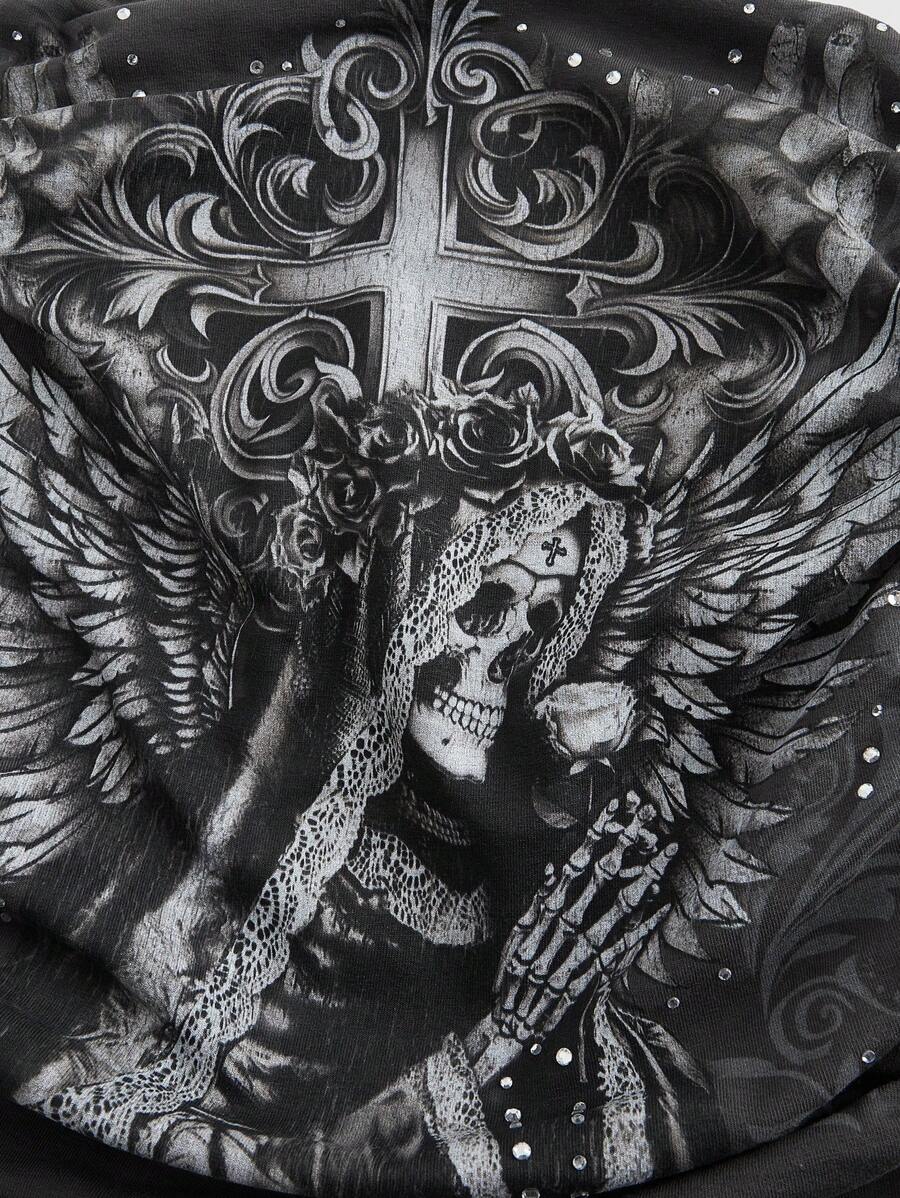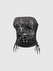 Fairycore Blusa con escote strapless, estampado de cráneo con rosa y strass, con drapeado