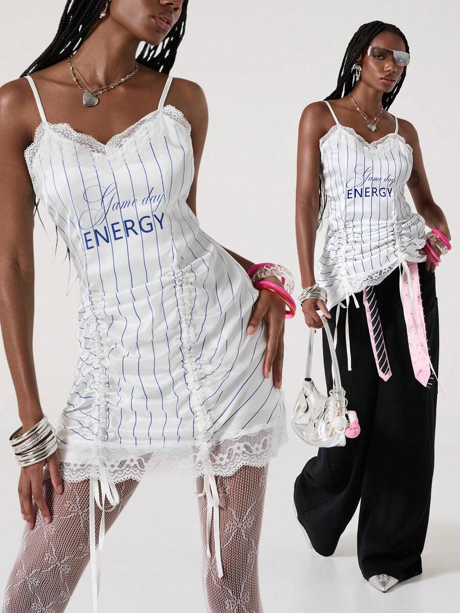 Y2K Vestido corto deportivo de mujer con cuello en V, cordón y encaje a rayas